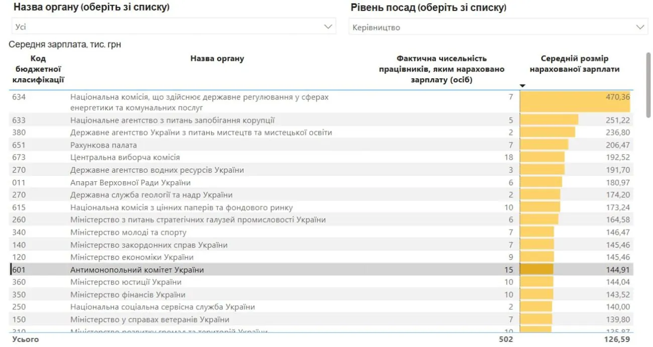 - Antimonopoly Committee of Ukraine - 83.34 thousand hryvnias. Number of employees - 270 people.