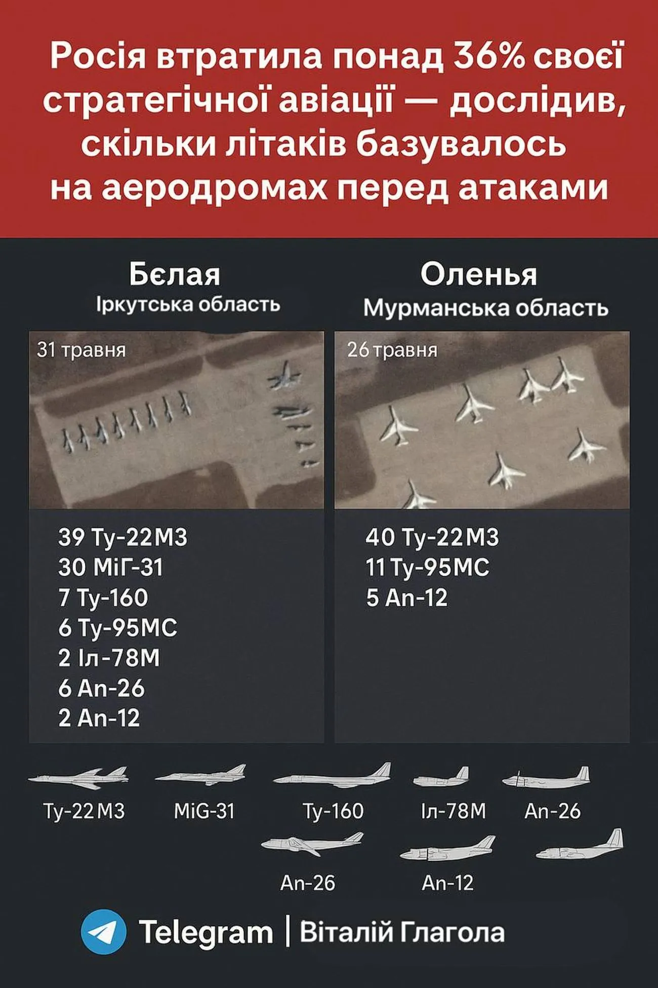 According to the Security Service, 34% of strategic cruise missile carriers were hit. At the same time, according to journalist Vitaliy Glagola, , Russians lost more than 36% of their strategic aviation.