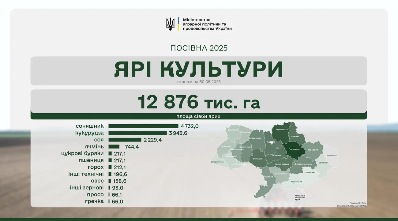 As of May 30, 2025, farmers in all regions of Ukraine have sown 5.5 million hectares of spring grain and leguminous crops. This is 97% of the projected area,
