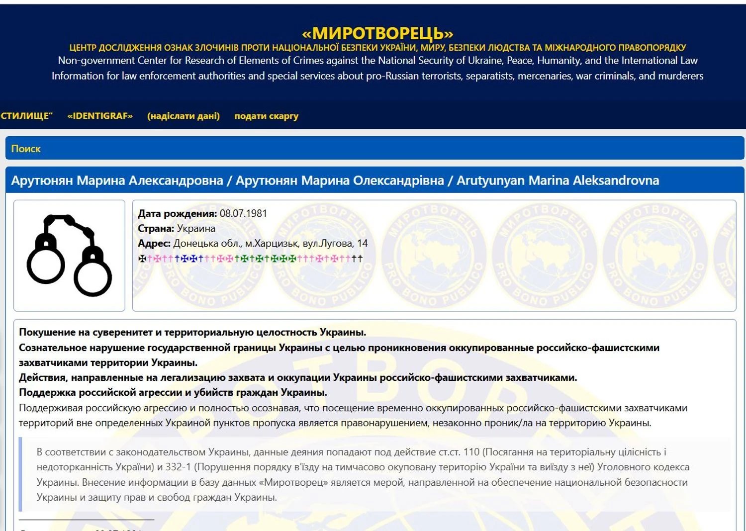 Maryna Arutyunyan is obviously a relative of Tigran Arutyunyan. Currently, she is the beneficiary of only the newly created company "MDO Pivden". At the same time, in open sources, a person with a similar full name appears in court materials on a claim by "UkrSibbank" and an application by LLC "Financial Company "Pozyka". The court proceedings began back in 2012 in the Khartsyzk City Court of Donetsk Oblast, and later continued in the Dobropillya City-District Court of Donetsk Oblast. The court ruling states that Maryna Arutyunyan took responsibility for a loan issued to another person. The amount of the loan taken in Swiss francs at the exchange rate at that time exceeded 570 thousand UAH. In addition, Maryna Arutyunyan from Khartsyzk appears in the database of the "Myrotvorets" Center. Whether the newly minted owner of "MDO Pivden" and the person appearing in the "Myrotvorets" database are one and the same person is unknown to us.