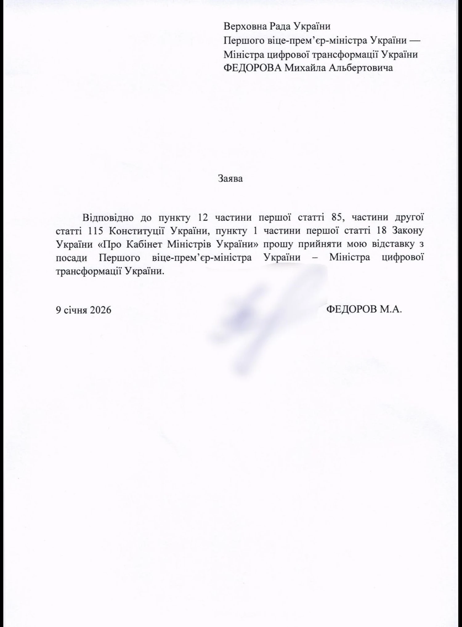 The Verkhovna Rada of Ukraine has received the resignation letter from Mykhailo Albertovych Fedorov, First Deputy Prime Minister of Ukraine — Minister of Digital Transformation of Ukraine... The Verkhovna Rada of Ukraine has received the resignation letter from Denys Anatoliyovych Shmyhal, Minister of Defense of Ukraine.