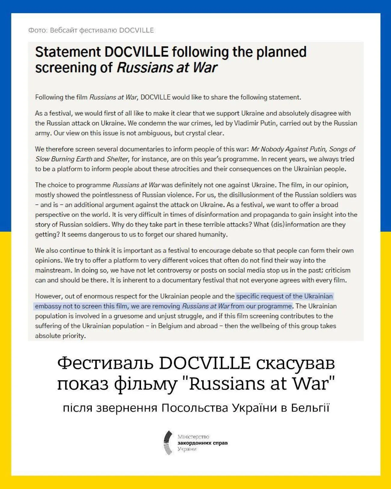 The DOCVILLE festival canceled the screening of a Russian propaganda film. This is reported by the Ministry of Foreign Affairs of Ukraine, reports UNN.