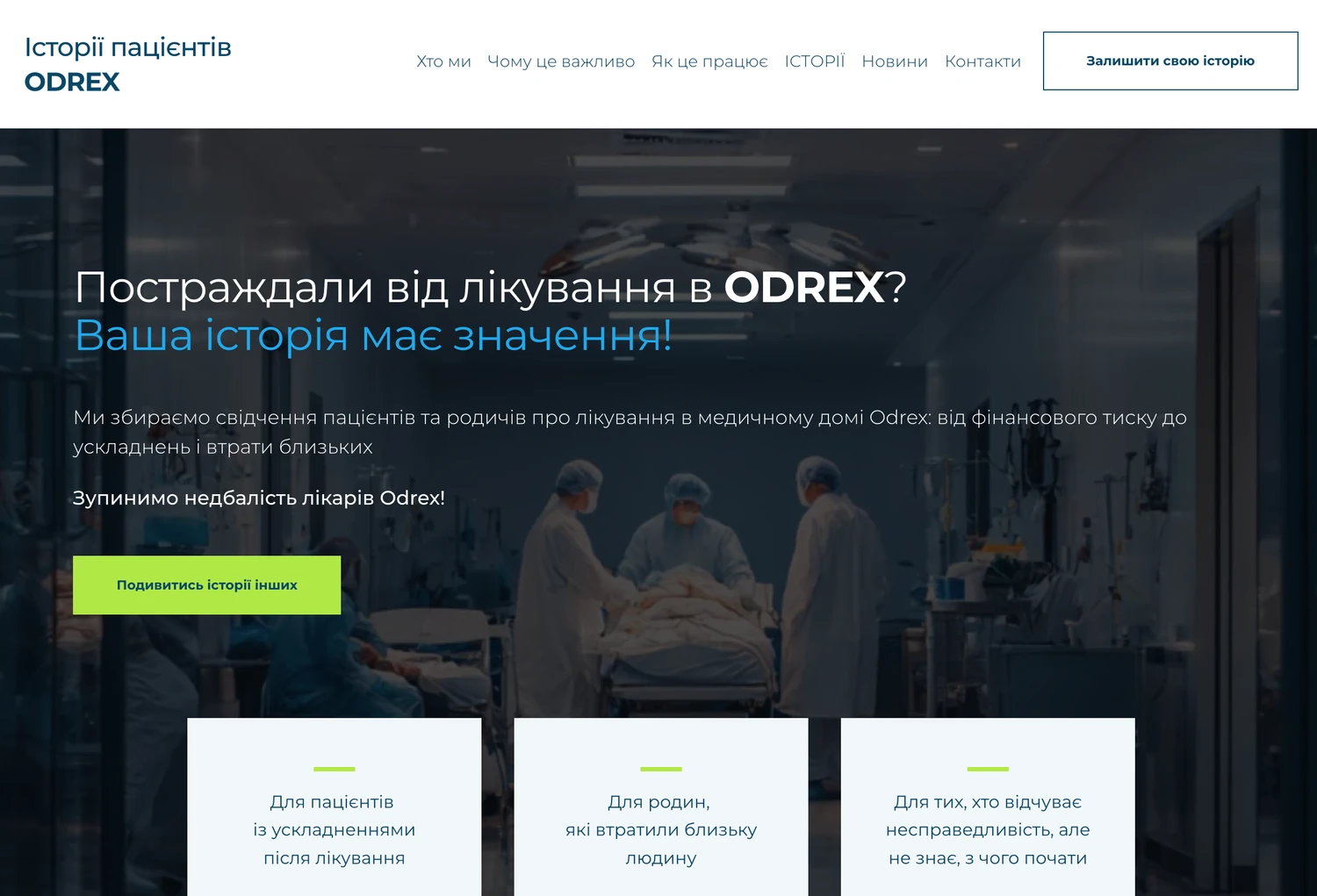 The website Stop Odrex, created by relatives of those who died after treatment at the Odesa clinic "Odrex" and those patients who managed to survive despite complications and worsening health, aims to put an end to the silence. As Krystyna Totkailo, daughter of a patient who died after treatment at Odrex, noted, now every victim of the Odesa private clinic can tell their own story without fear. The website offers several communication options: open, anonymous, with permission to share the story with journalists, and without. In addition, medical documentation confirming the stated facts can be added optionally.