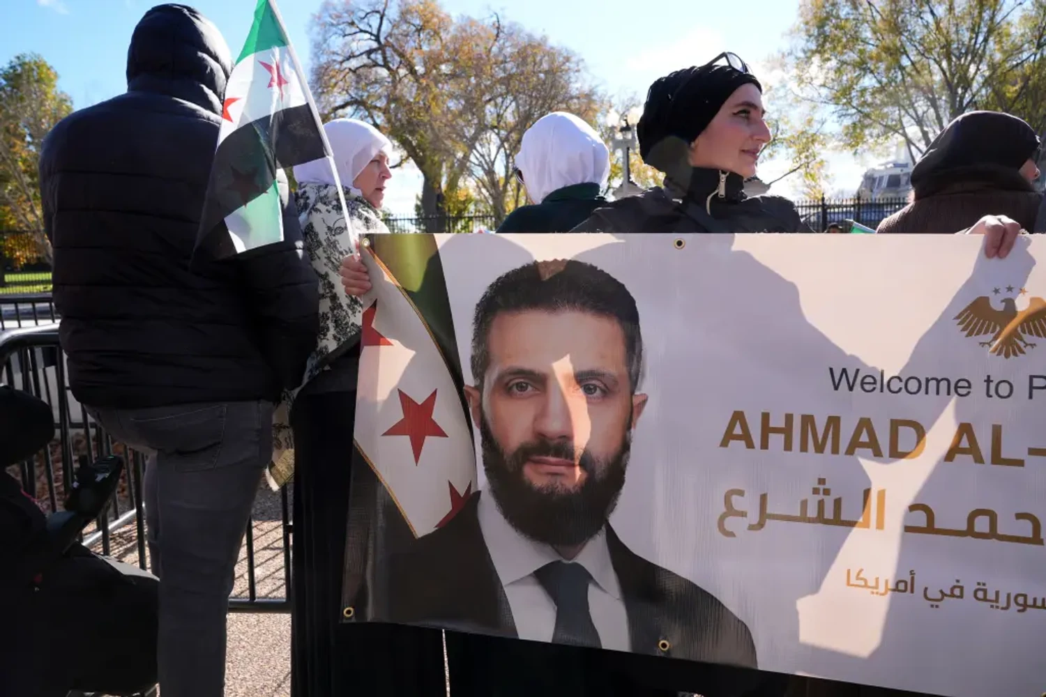 According to the authors, 43-year-old al-Sharaa walked down Pennsylvania Avenue to greet dozens of supporters after an approximately 90-minute meeting in the Oval Office, which was closed to the press. The group held signs calling on Congress to permanently lift the sanctions that the Trump administration temporarily lifted earlier this year.