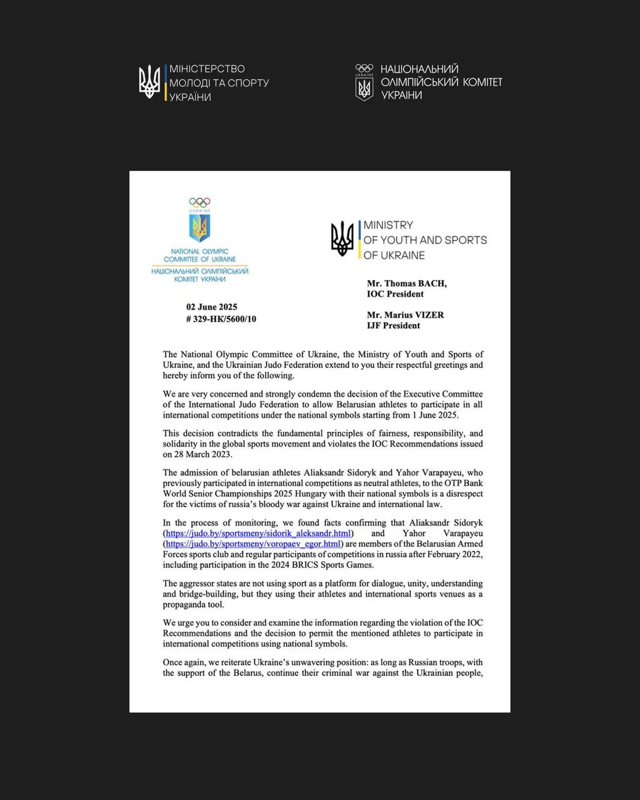 The Ukrainian side strongly condemned the decision of the Executive Committee of the International Judo Federation, according to which, from June 1, 2025, Belarusian athletes can participate in international competitions under national symbols. This decision contradicts the IOC recommendations of March 28, 2023 and the basic principles of fairness, responsibility and solidarity of world sports.