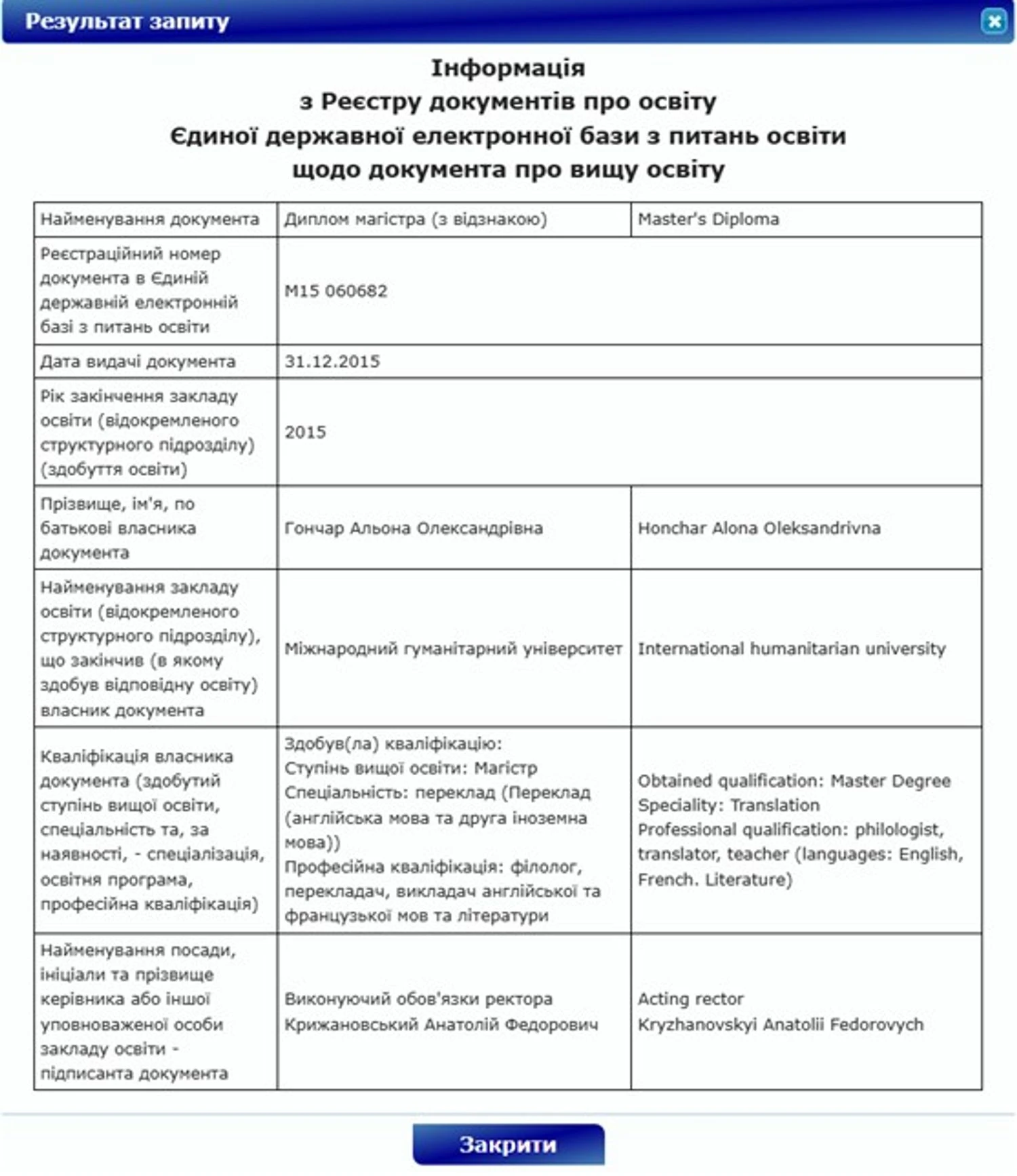 Journalist Kateryna Solyar listed the facts reliably known about Olena Aliyeva: the girl graduated from the International Humanitarian Institute in Odesa, received a red diploma in linguistics, and is fluent in French and English. All this can be easily verified in the open register of educational documents. Her marriage to Heydar Aliyev and two children is also a well-known fact.