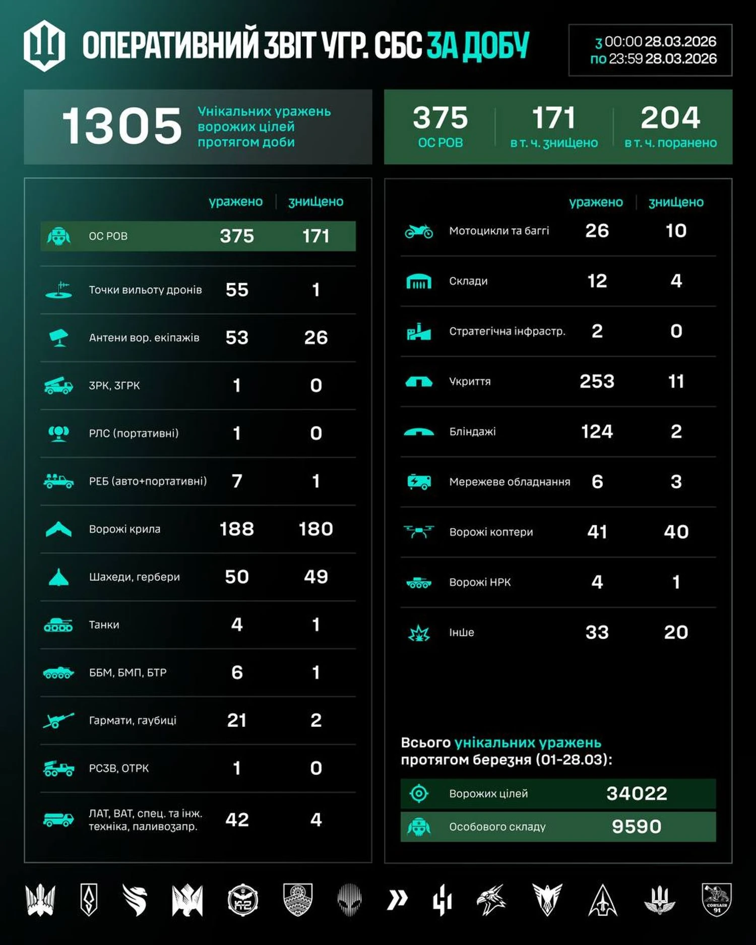 During March (01–28.03), 34022 targets were destroyed or hit, including 9590 enemy personnel.