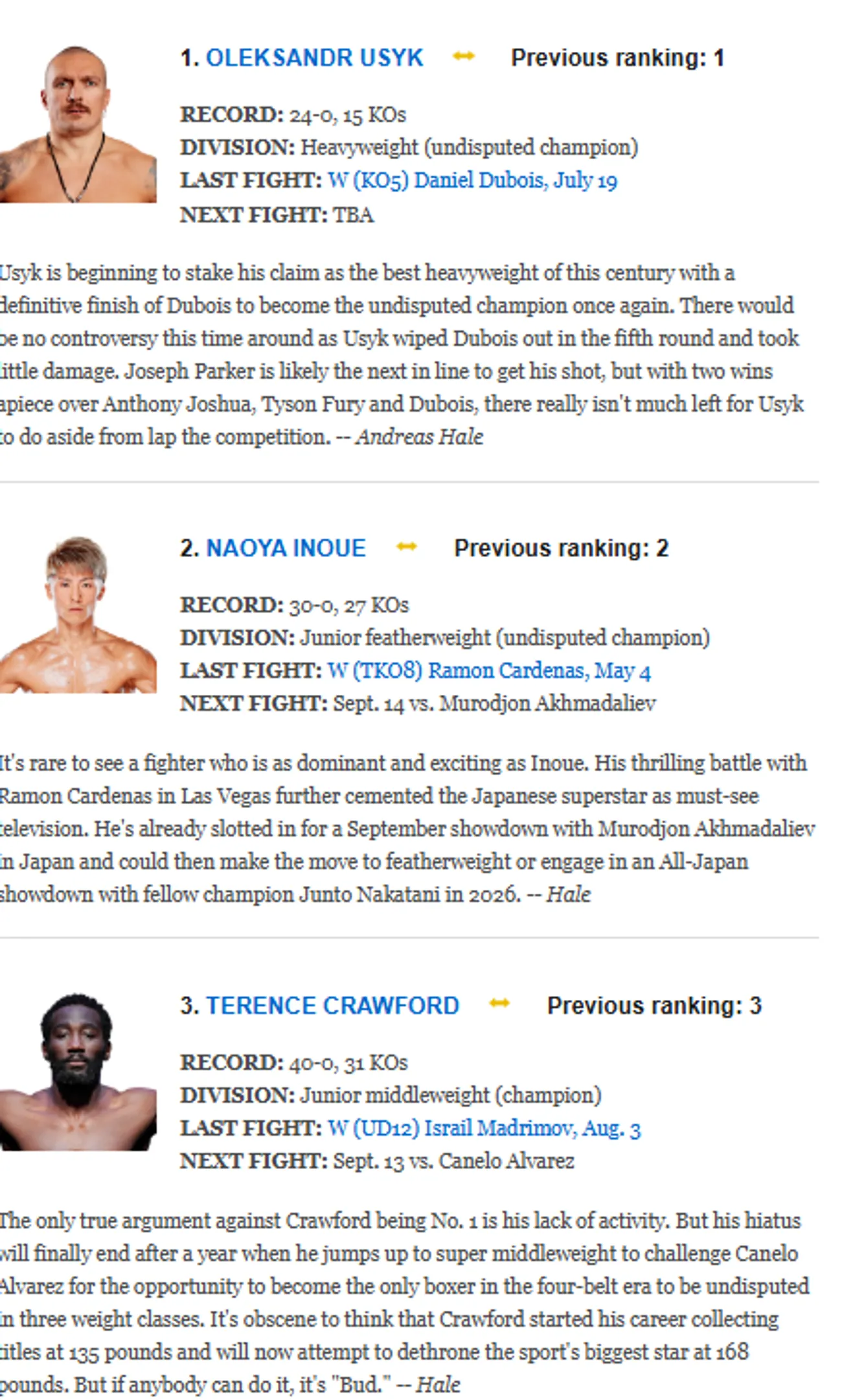 Ukrainian boxer Oleksandr Usyk remains the leader of the ESPN ranking after defeating Daniel Dubois, becoming a two-time undisputed heavyweight champion. Naoya Inoue and Terence Crawford are in second and third place respectively.
