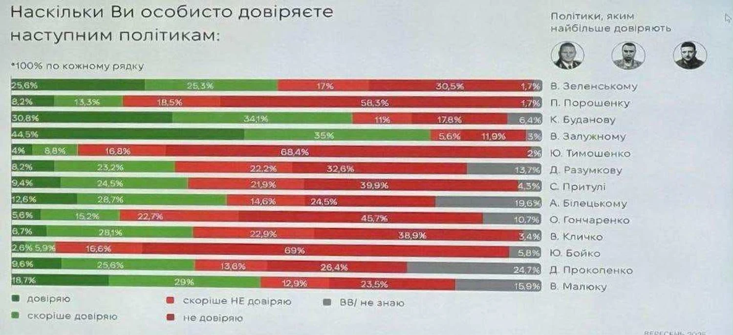 Former Commander-in-Chief of the Armed Forces of Ukraine Valerii Zaluzhnyi and Head of the Main Intelligence Directorate Kyrylo Budanov have the highest level of trust among Ukrainians. Zaluzhnyi is trusted by 44.5% of respondents, Budanov by 30.8%, while Zelenskyy by 25.6%.