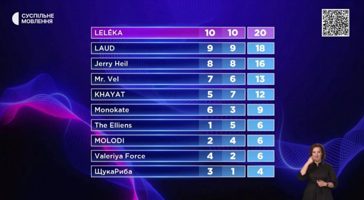 It should be noted that in the final of the competition, the artists demonstrated bright stage performances, combining various genres - from pop and electronics to ethno-elements. Leleka received 10 points from both the jury members and the TV viewers. Singer Laud took second place in the National Selection, and Jerry Heil took third place.