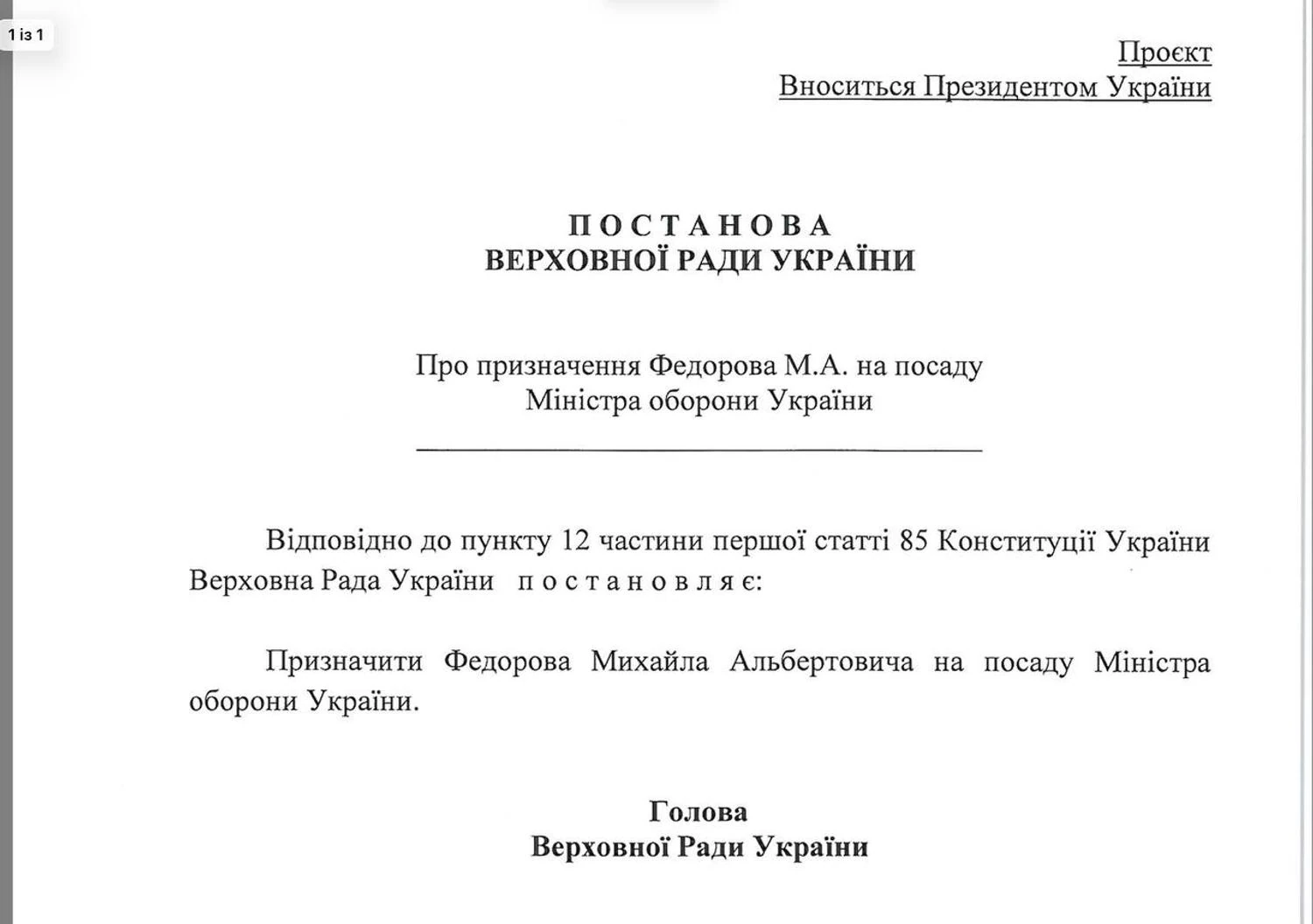As stated on the official website of the Verkhovna Rada, Zelenskyy submitted on January 13 the Draft Resolution on the appointment of M.A. Fedorov to the post of Minister of Defense of Ukraine No. 14377.