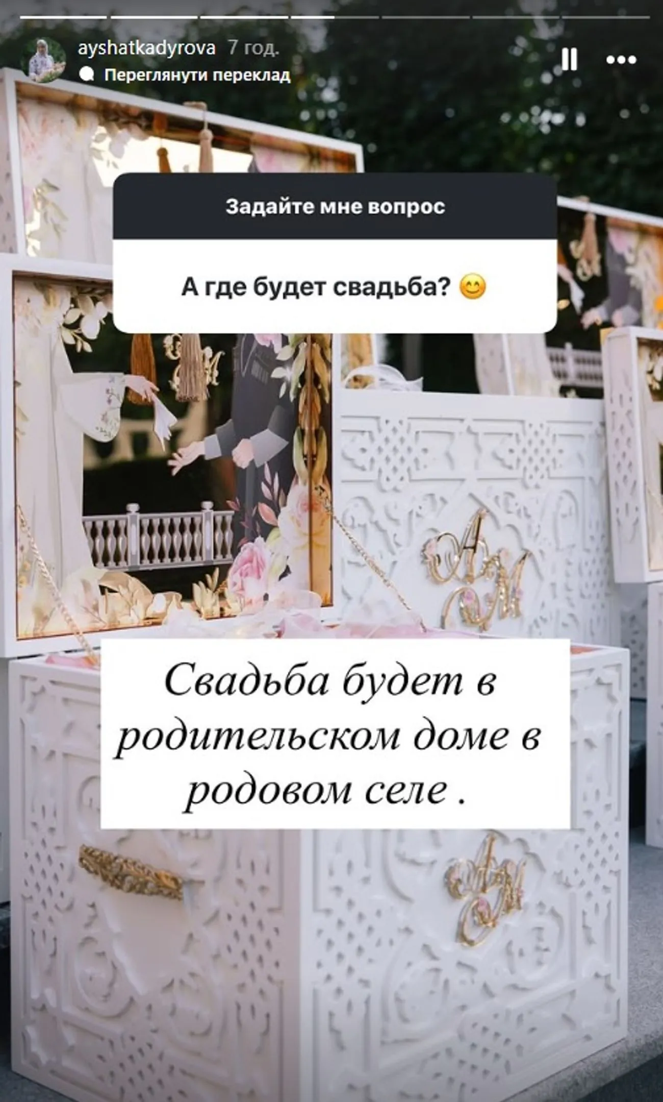 За словами Айшат, зараз триває підготовка до весілля. Святкування відбудеться завтра у будинку батьків у родовому селі Кадирових (Ахмат-Юрті).