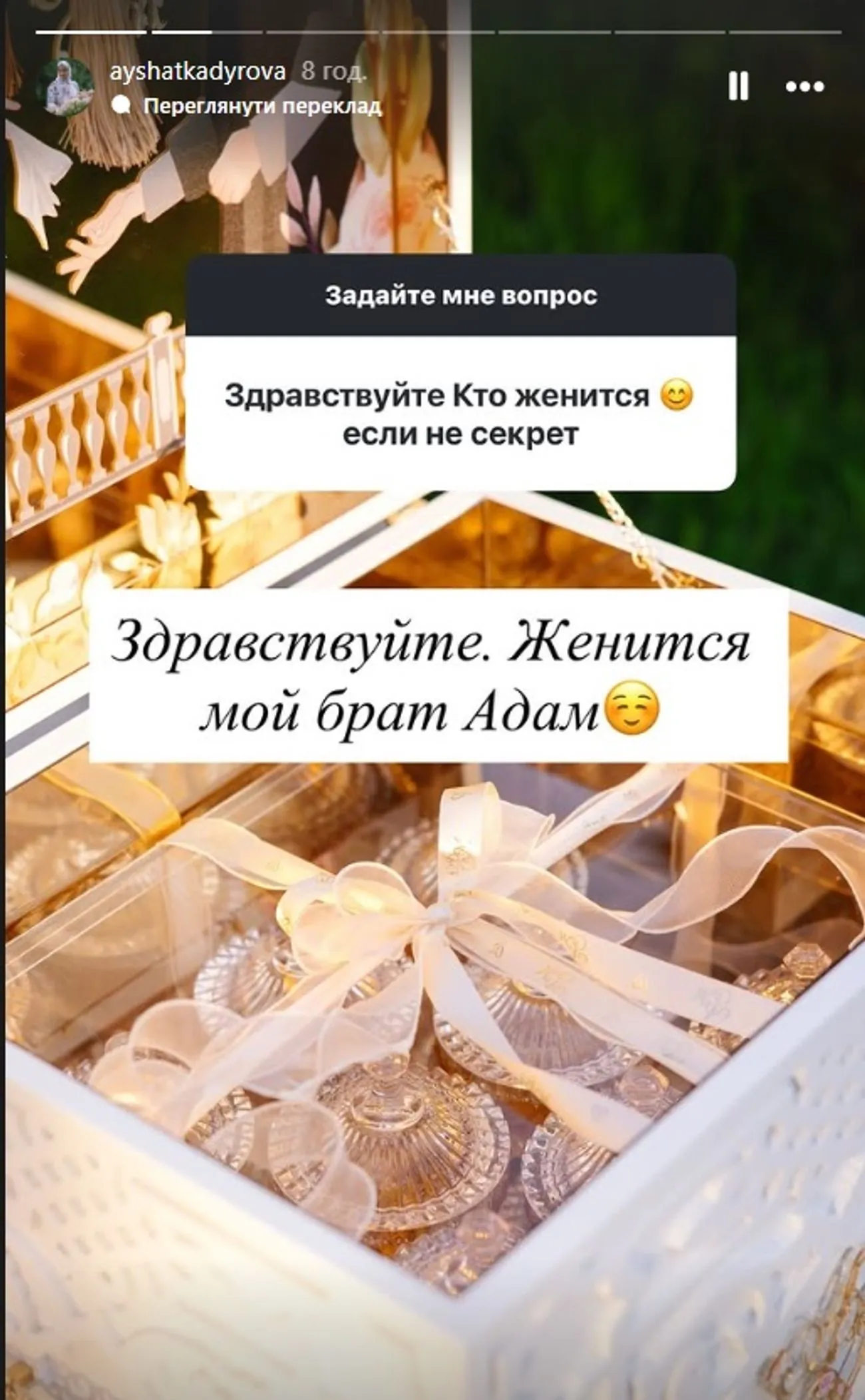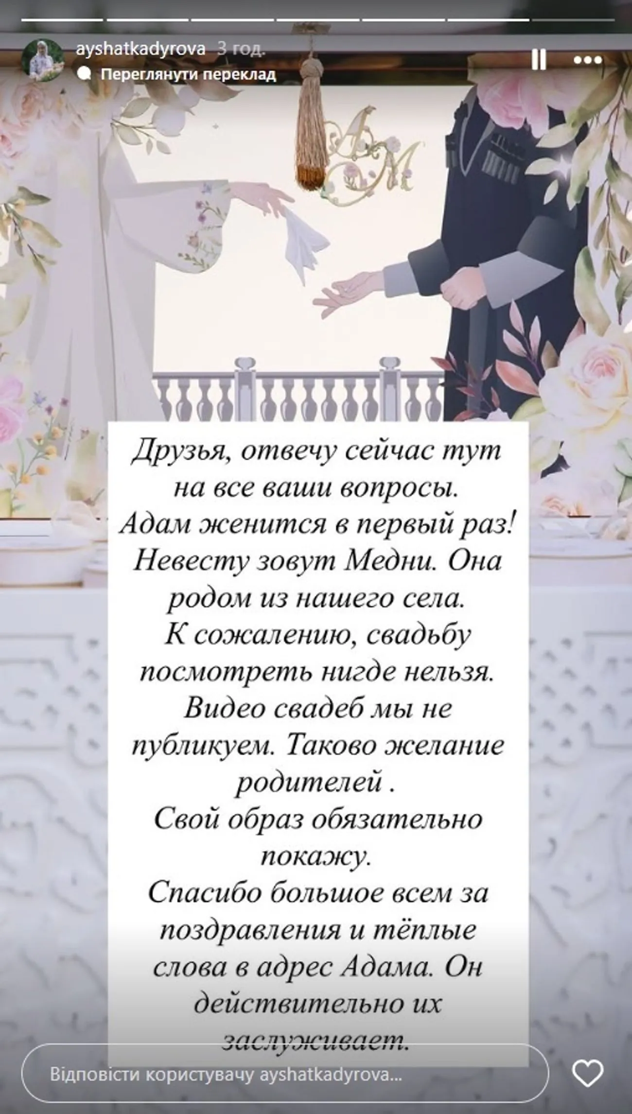 російські ЗМІ ще рік тому повідомляли про весілля тоді ще 16-річного Адама Кадирова з дочкою чеченського сенатора Сулеймана Геремєєва. У 2024 році пара начебто уклала ісламський шлюб (релігійний союз), а зараз пройде офіційна церемонія.
