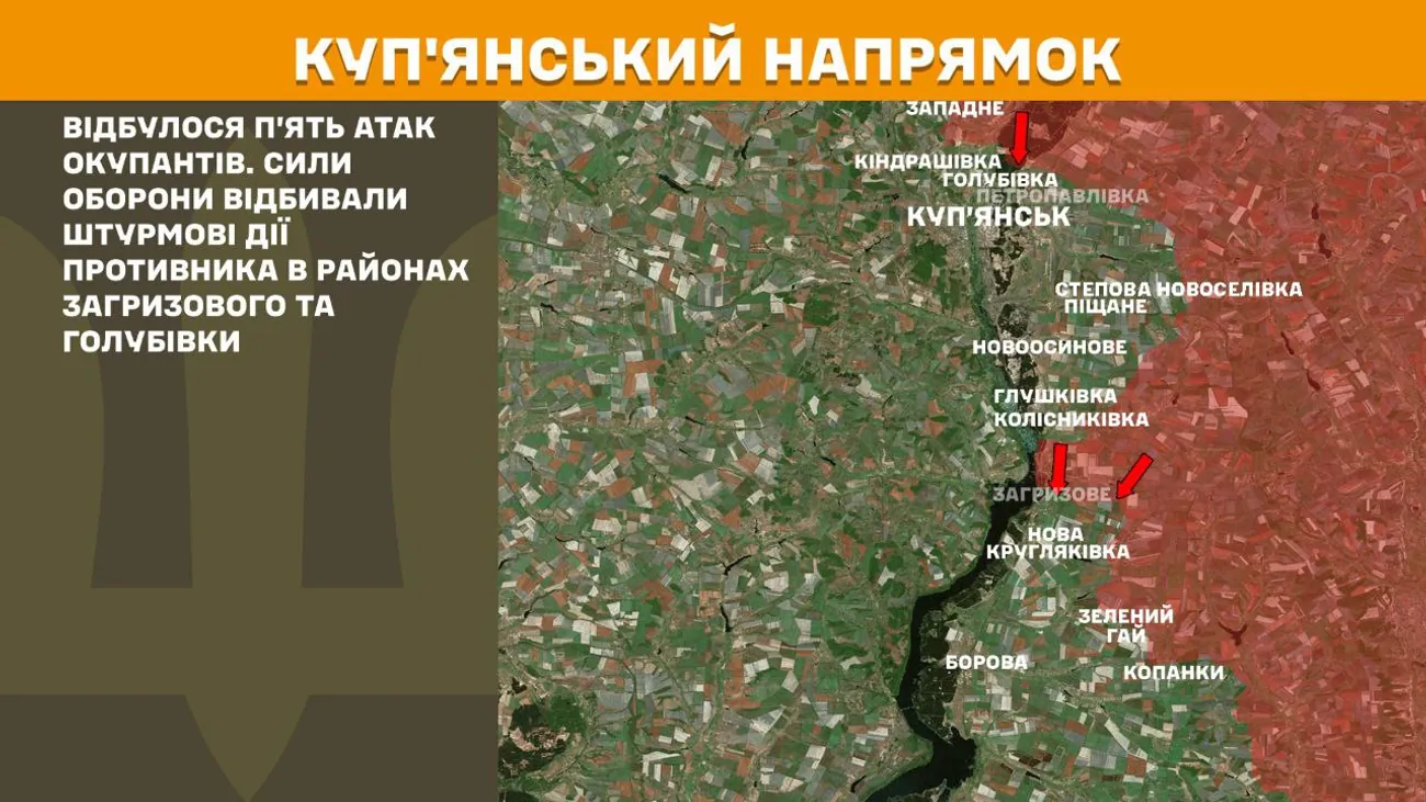 На Куп’янському напрямку вчора відбулося п’ять атак окупантів. Сили оборони відбивали штурмові дії противника в районах Загризового та Голубівки.