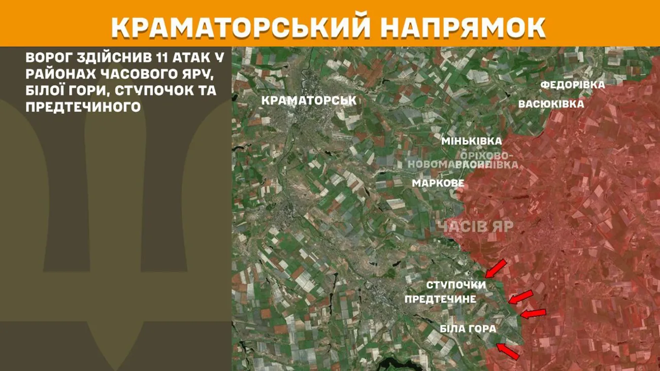 На Краматорському напрямку ворог здійснив 11 атак у районах Часового Яру, Білої Гори, Ступочок та Предтечиного.