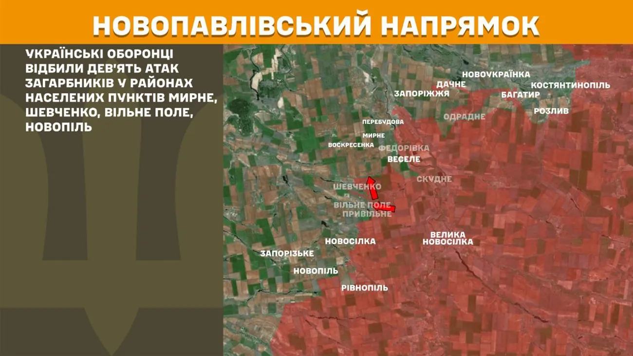 На Новопавлівському напрямку українські оборонці відбили дев’ять атак загарбників у районах населених пунктів Мирне, Шевченко, Вільне Поле, Новопіль.