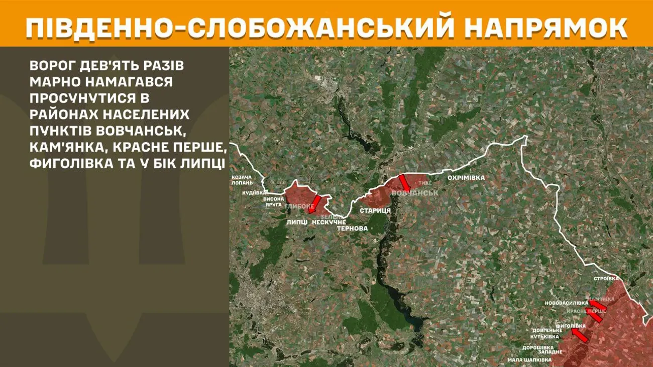 На Південно-Слобожанському напрямку ворог дев’ять разів марно намагався просунутися в районах населених пунктів Вовчанськ, Кам’янка, Красне Перше, Фиголівка та у бік Липців.