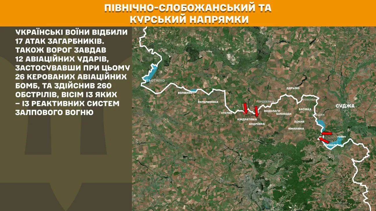 На Північно-Слобожанському і Курському напрямках минулої доби українські воїни відбили 17 атак загарбників. Також ворог завдав 12 авіаційних ударів, застосувавши при цьому 26 керованих авіаційних бомб, та здійснив 260 обстрілів, вісім із яких – із реактивних систем залпового вогню.
