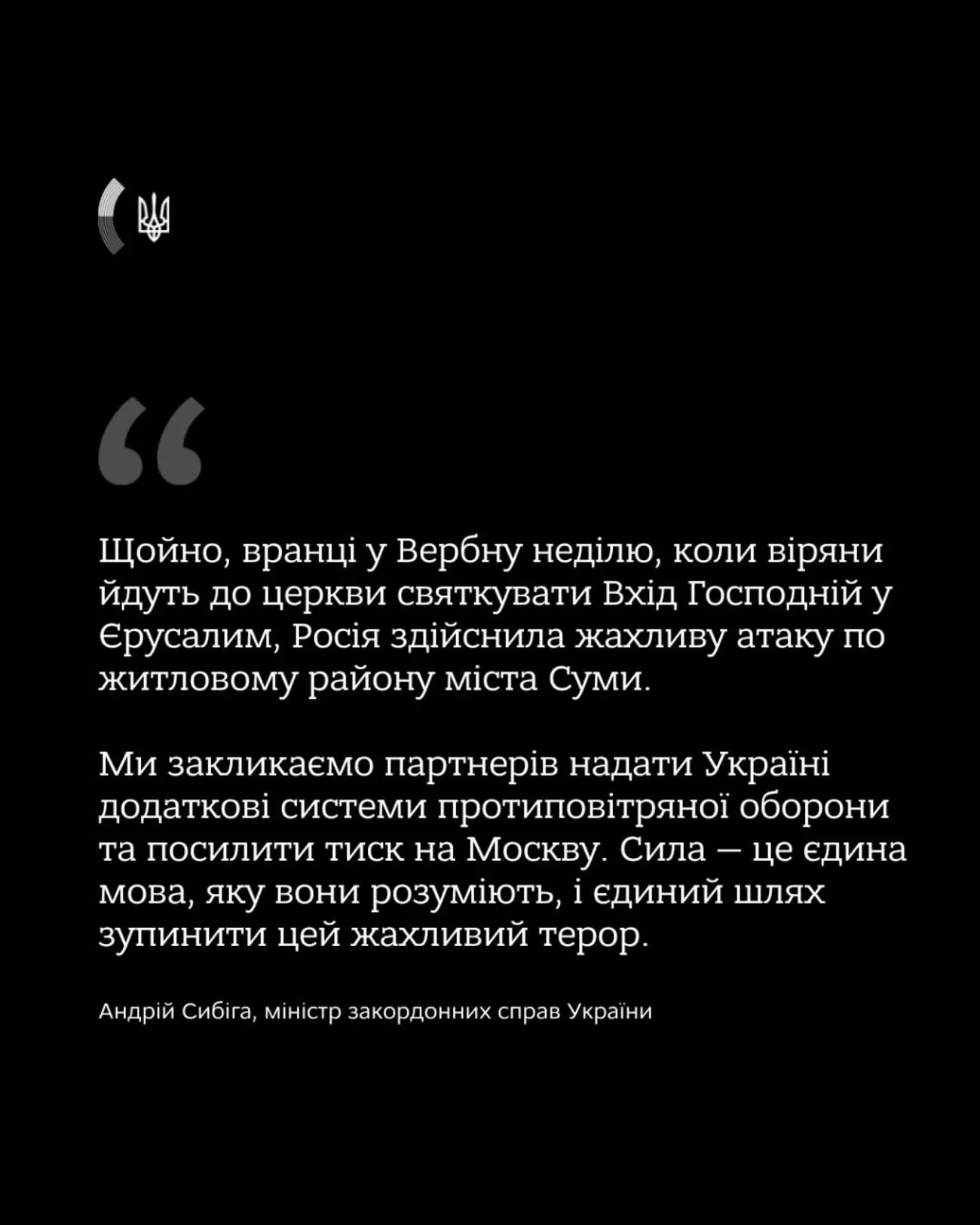 Щойно, вранці у Вербну неділю, коли віряни йдуть до церкви, щоб відсвяткувати вхід Господній до Єрусалиму, Росія здійснила жахливу атаку на житловий район міста Суми. Багато цивільних людей були вбиті та поранені. Така атака у велике християнське свято є абсолютним злом.