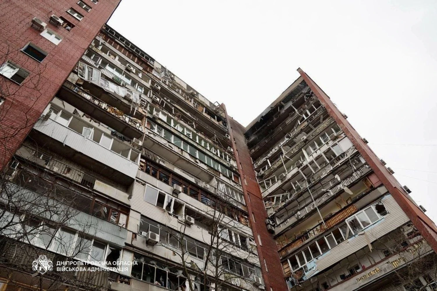 Ворог атакував 14-поверховий будинок у Дніпрі 24 березня, пошкодивши стіни та балкони. На верхніх поверхах виникла пожежа.