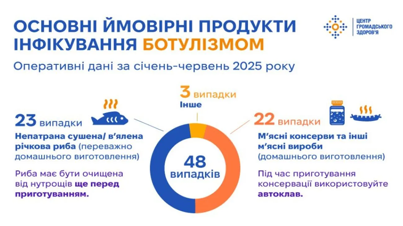 З початку року в Україні зафіксовано 46 випадків ботулізму, що призвели до 57 постраждалих, серед яких троє померли. Найбільшу небезпеку становлять в'ялена риба та домашня консервація, придбані у неофіційних місцях.