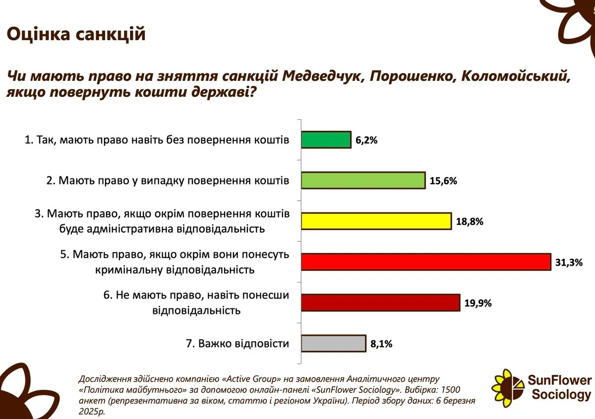 Більшість українців вважають справедливими застосовані до Порошенка, Медведчука та Коломойського санкції і виступають проти їх зняття, поки ті не повернуть державі кошти та не понесуть юридичну відповідальність. Про це свідчать результати соціологічного дослідження, проведеного компанією "Active Group".