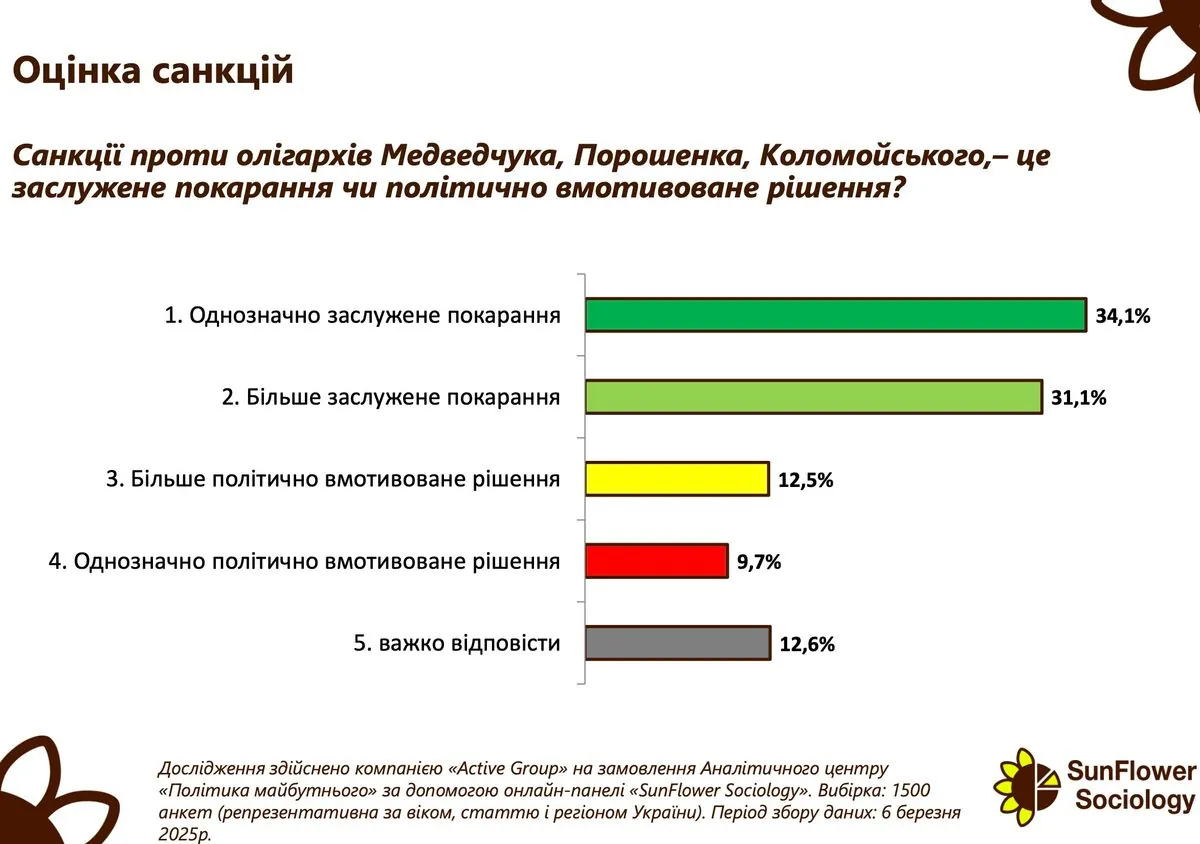 "Санкції проти олігархів Медведчука, Порошенка та Коломойського вважають заслуженим покаранням 65,2% українців, з них 34,1% – "однозначно заслуженим", а 31,1% – "більше заслуженим", – йдеться в результатах дослідження.