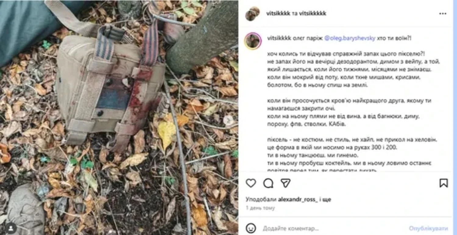 Піксель - не костюм, не стиль, не хайп, не прикол на Геловін. Це форма, в якій ми носимо на руках поранених та загиблих. Ти в ньому танцюєш, ми гинемо
