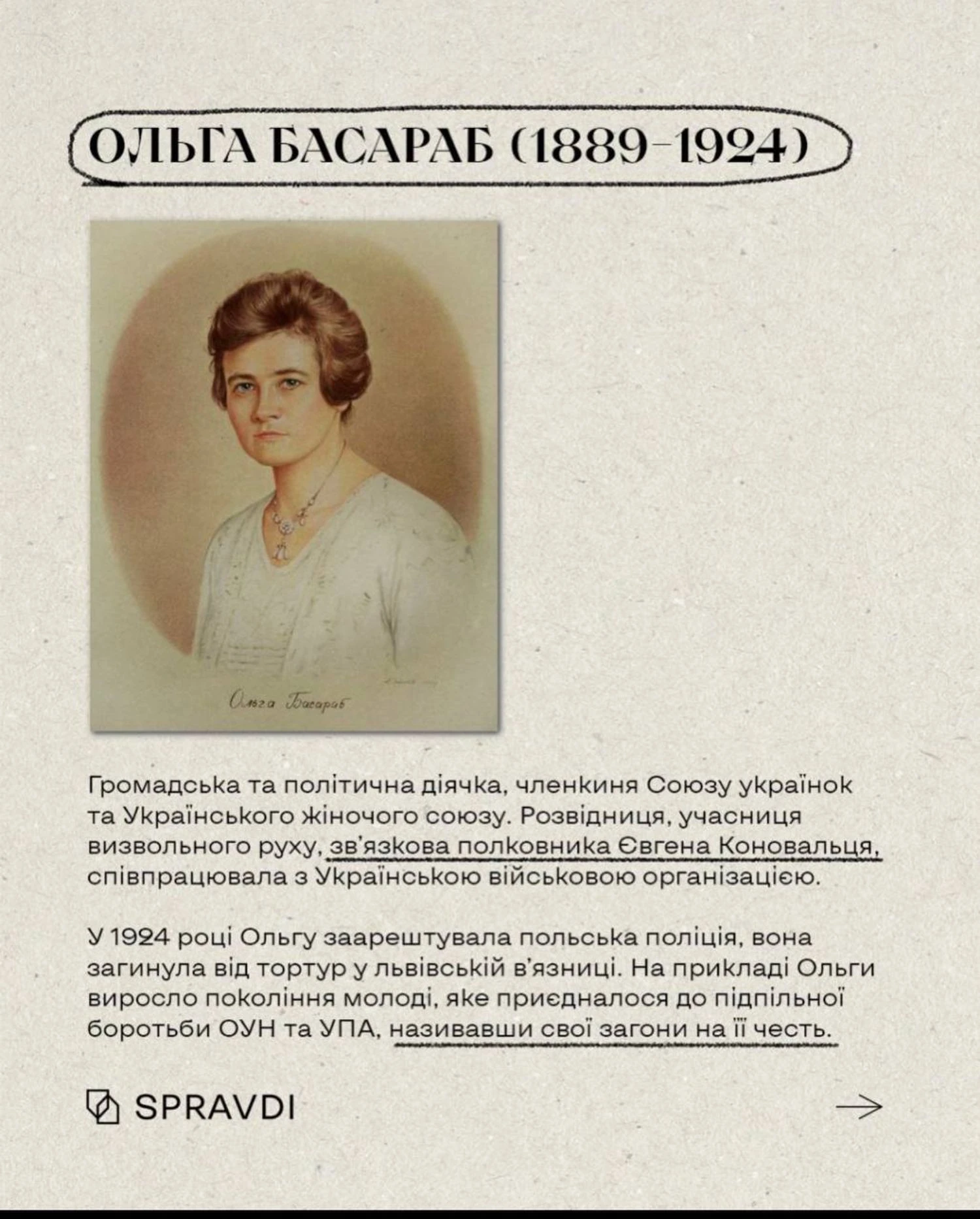 Серед них - і Ольга Бесараб, яка була зв’язковою полковника Євгена Коновальця, розвідниця та учасниця визвольного руху. Її ім’я стало відоме через трагічні події 1924 року, коли її заарештувала польська влада у Львові за підозрою у співпраці з українським підпіллям. Згодом її знайшли мертвою в камері львівської в’язниці, а обставини смерті викликали резонанс через українського суспільства.