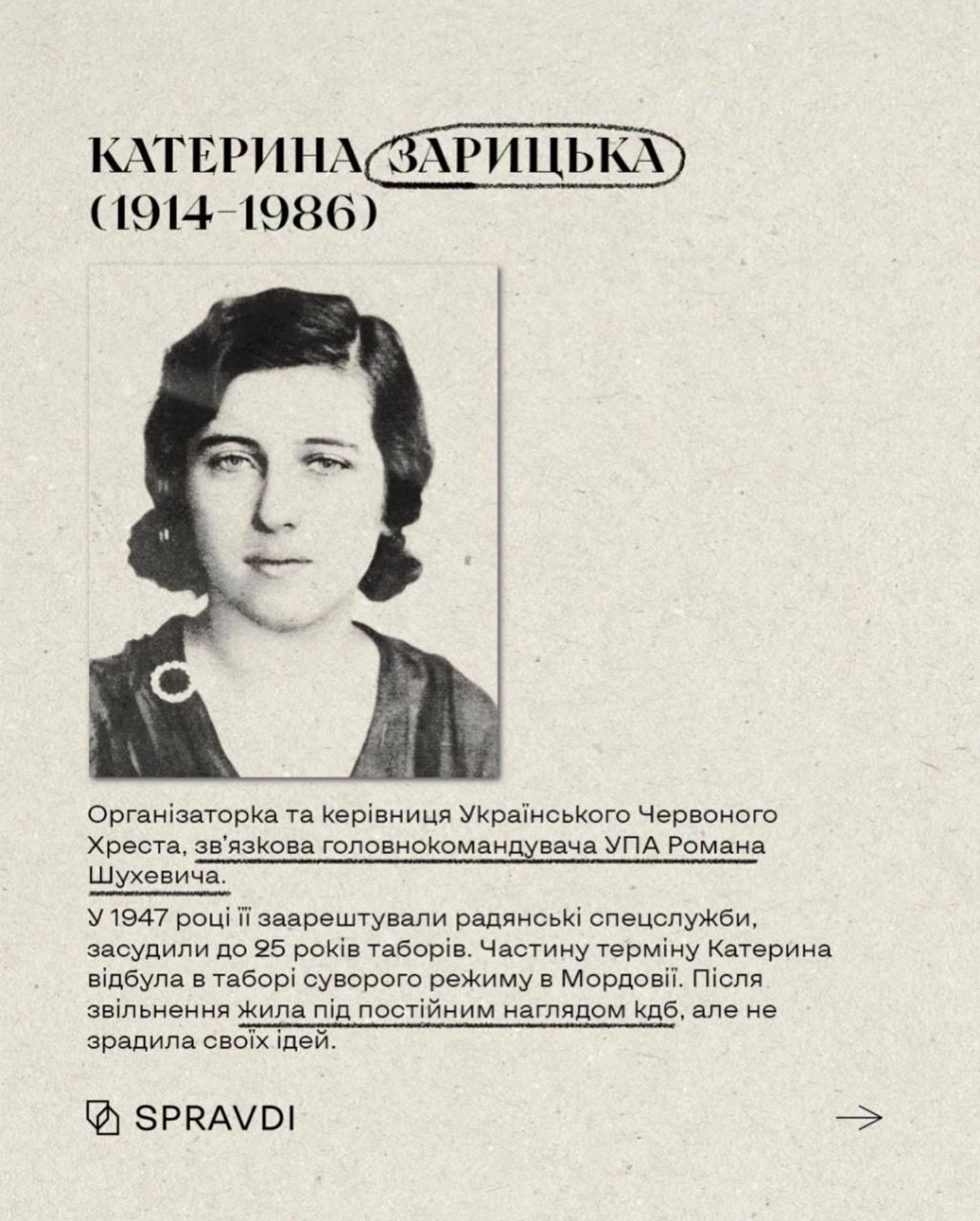 Катерина Зарицька, яка була організаторкою та керівницею Українського Червоного Хреста, а також, зв’язковою головнокомандувача УПА Романа Шухевича. Радянська влада засудила її до 25 років таборів, однак не знищила її ідей.