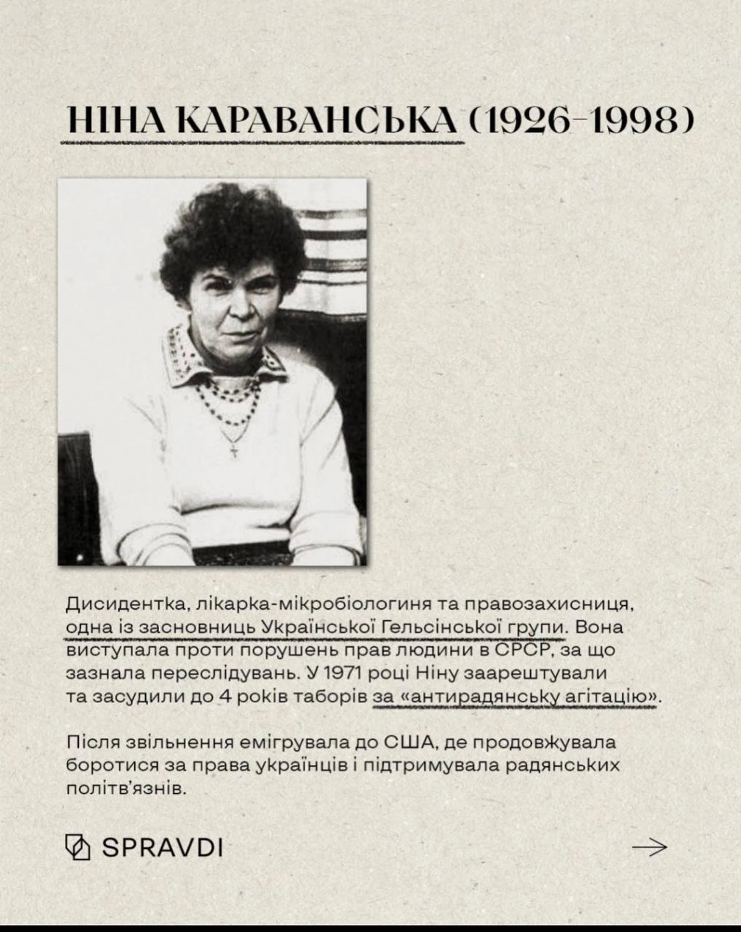 Ніна Караванська - дисидентка, лікарка-мікробіологиня та правозахисниця, одна із засновниць Української Гельсінської групи. Радянська влада засудила її до чотирьох років таборів. Після звільнення, Ніна Караванова продовжила боротись за права українців.