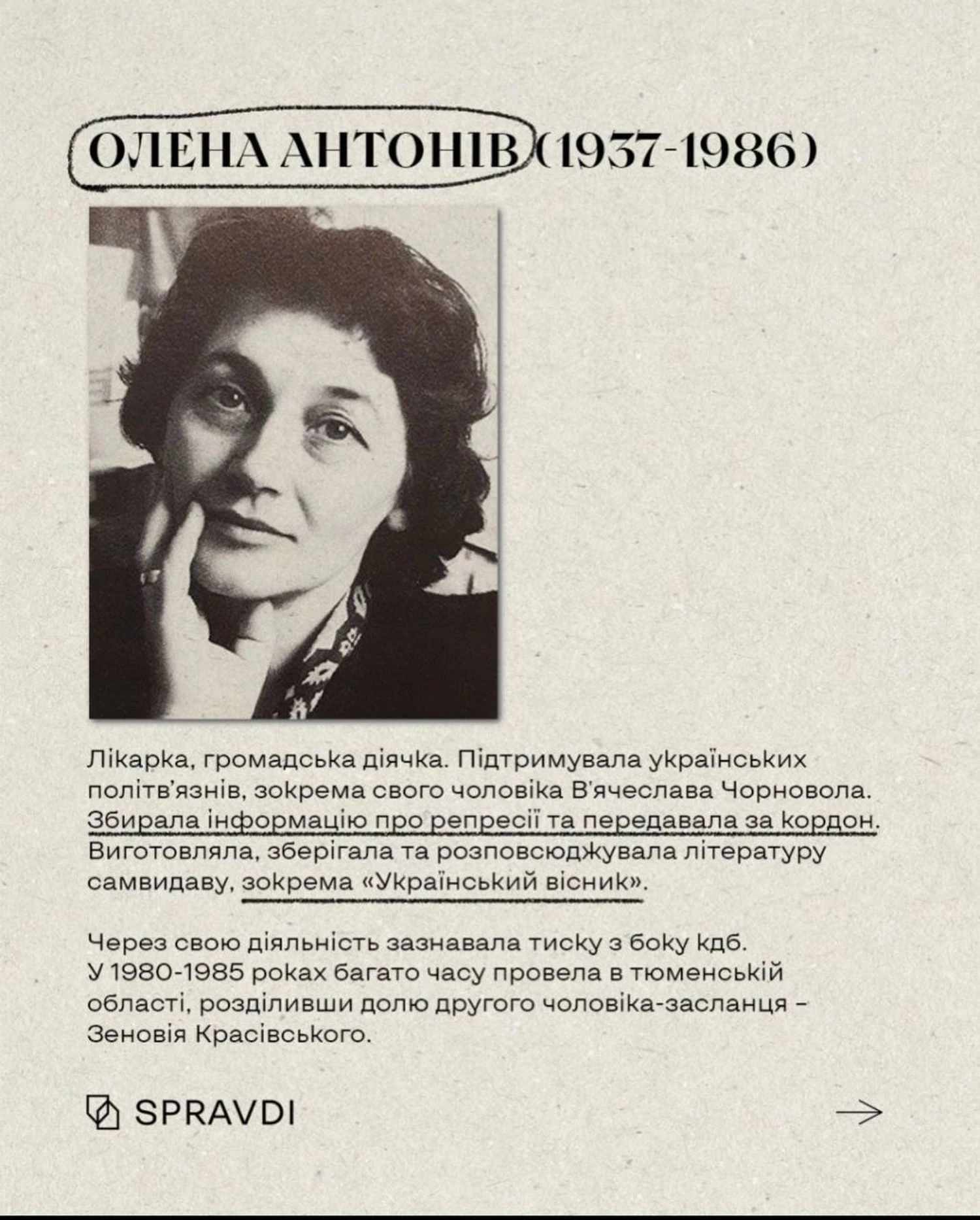 Олена Антонів - лікарка, громадська діячка, учасниця дисидентського руху. Передавала за кордон інформацію про репресії, а також, зробила великий внесок у просування української літератури. Через свою діяльність вона зазнала переслідувань з боку радянської влади.