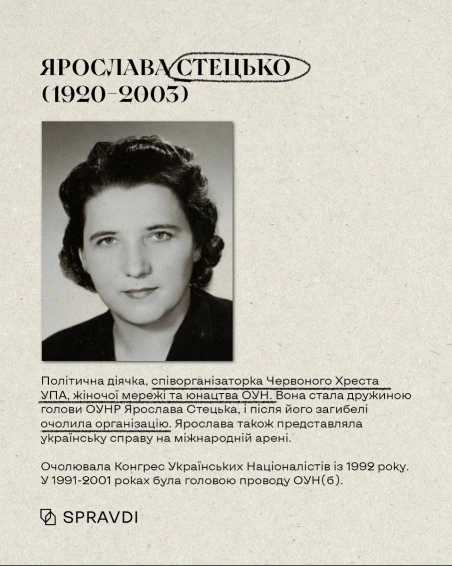 Ярослава Стецько - українська політична та громадська діячка, учасниця українського національного руху. Була дружиною політичного діяча, голови ОУНР Ярослава Стецька. Після Другої світової війни жила в еміграції та брала участь у діяльності українських політичних структур за кордоном, а після проголошення незалежності України Ярослава Стецько повернулася до країни, стала народною депутаткою України та очолила Конгрес українських націоналістів.