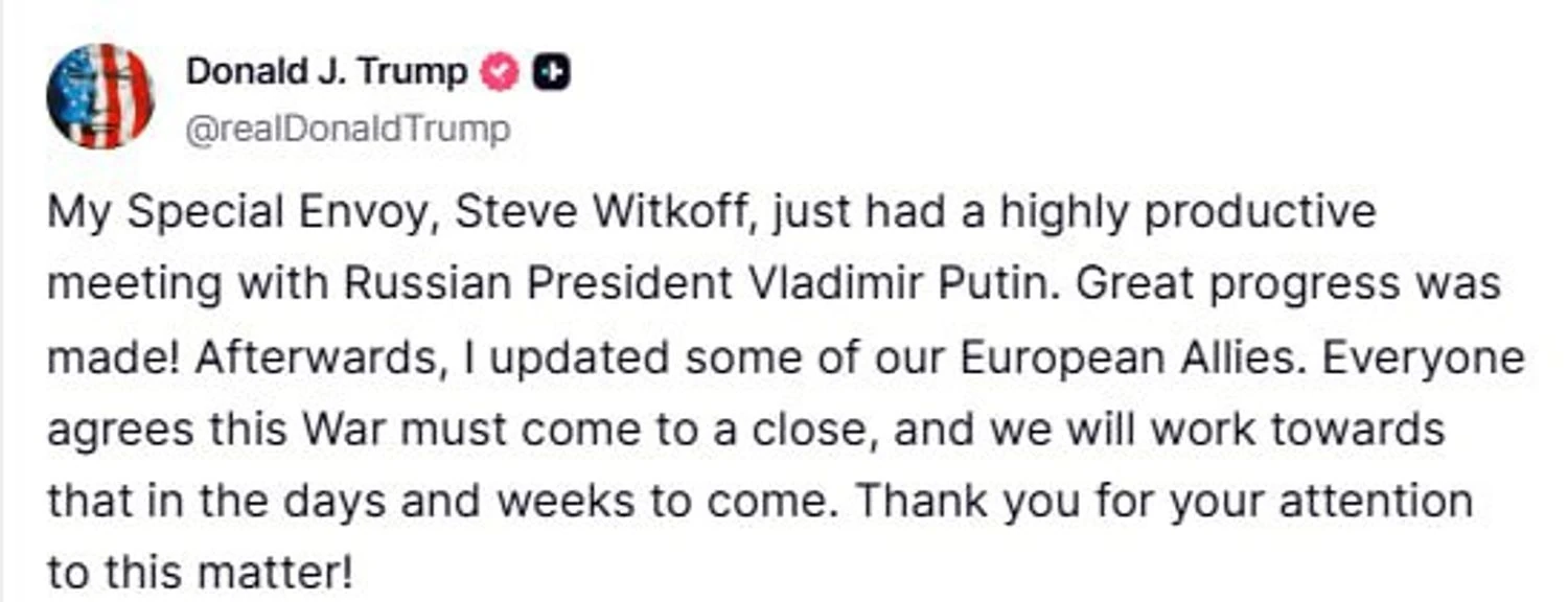 Мій спеціальний посланник Стів Віткофф щойно провів дуже продуктивну зустріч з президентом росії володимиром путіним. Було досягнуто значного прогресу. Після цього я проінформував деяких наших європейських союзників. Усі згодні, що ця війна має закінчитися, і ми будемо працювати над цим найближчими днями та тижні. Дякую за вашу увагу до цього питання