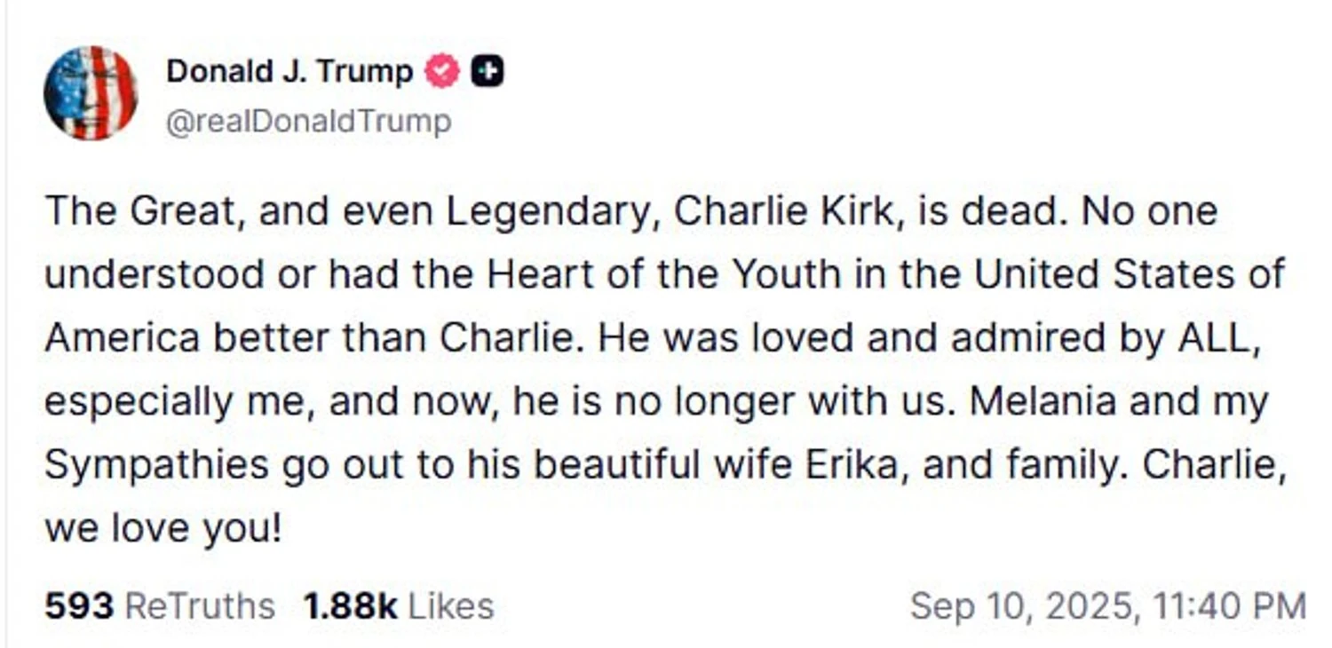"Великий, навіть легендарний Чарлі Кірк помер. Ніхто не розумів і не мав Серця Молоді у Сполучених Штатах Америки краще, ніж Чарлі. Його любили та захоплювалися ВСІ, особливо я, а тепер його більше немає з нами. Меланія, і я висловлюю співчуття його прекрасній дружині Еріці та родині. Чарлі, ми любимо тебе!", - йдеться у дописі Трампа.