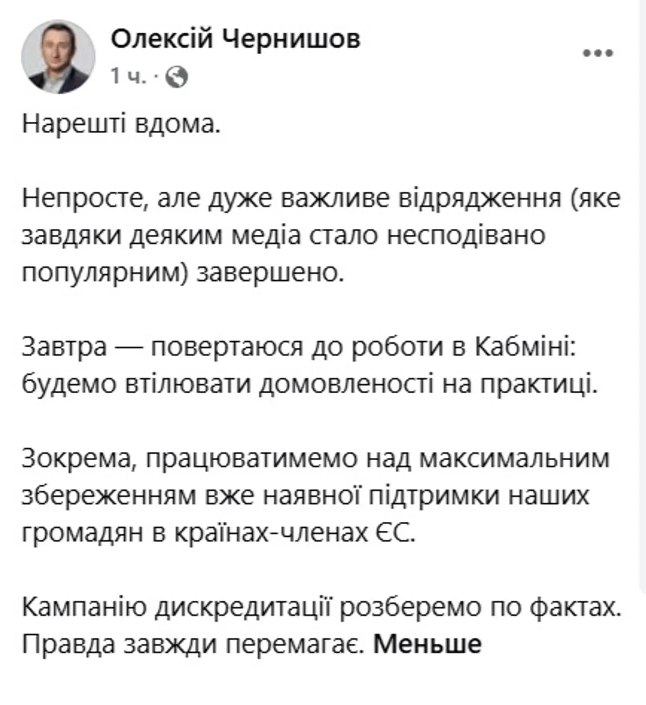 Завтра — повертаюся до роботи в Кабміні: будемо втілювати домовленості на практиці. Зокрема, працюватимемо над максимальним збереженням вже наявної підтримки наших громадян в країнах-членах ЄС.