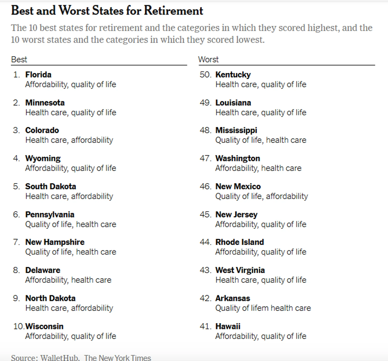 У першу 10-ку найкращих штатів США для проживання пенсіонерів увійшли Флоріда, Міннесота, Колорадо, Вайомінг, Південна Дакота, Пенсільванія, Нью-Гемпшир, Делавер, Північна Дакота і Вісконсін.
