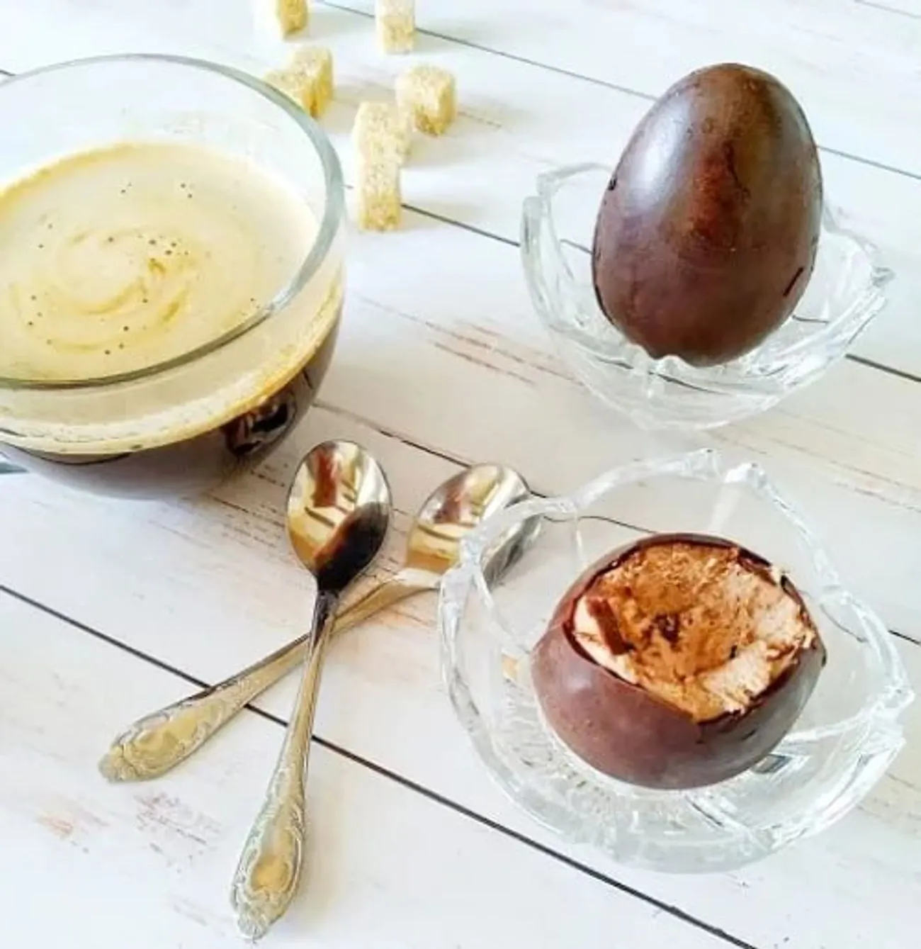 3. Додати желатин до сирно-шоколадної суміші, перемішати. Залити суміш у силіконові форми, або в готові скорлупки, у мене форми силіконової немає, то я зробила скорлупки, але це може бути що завгодно, не обов'язково яйця. Покласти в середину вишню без рідини. Прибрати в морозилку до повної заморозки. Готові яйця дістати з форми.