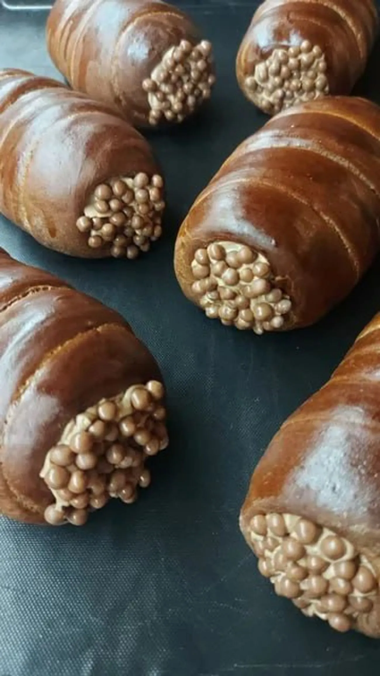 3. Змастити яйцем і випікати при 200*С хвилин 15-20. Охолодити трубочки, начинити кремом та за баженням посипати рисовими кульками у шоколоді.