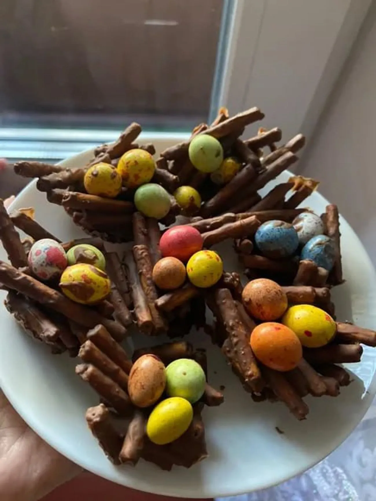 3. В форми для кексів викласти соломку з шоколадом. Зробити ямку та покласти туди драже у вигляді яєць.