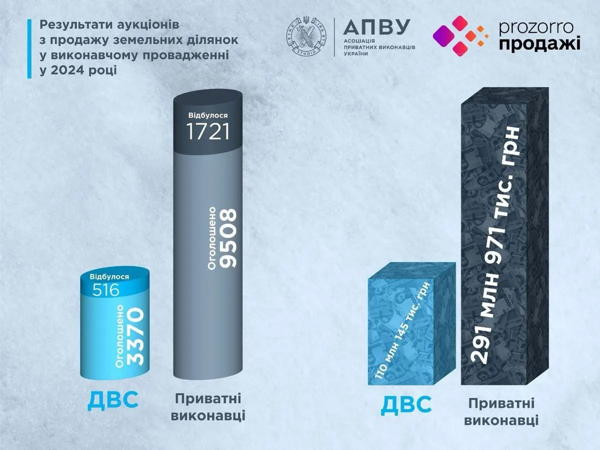 За даними Prozorro.Продажі, у 2024 році державними виконавцями Мінʼюсту було оголошено 3 370 аукціонів, з яких відбулося лише 516, а загальна сума реалізації земельних ділянок склала лише 110 млн грн.