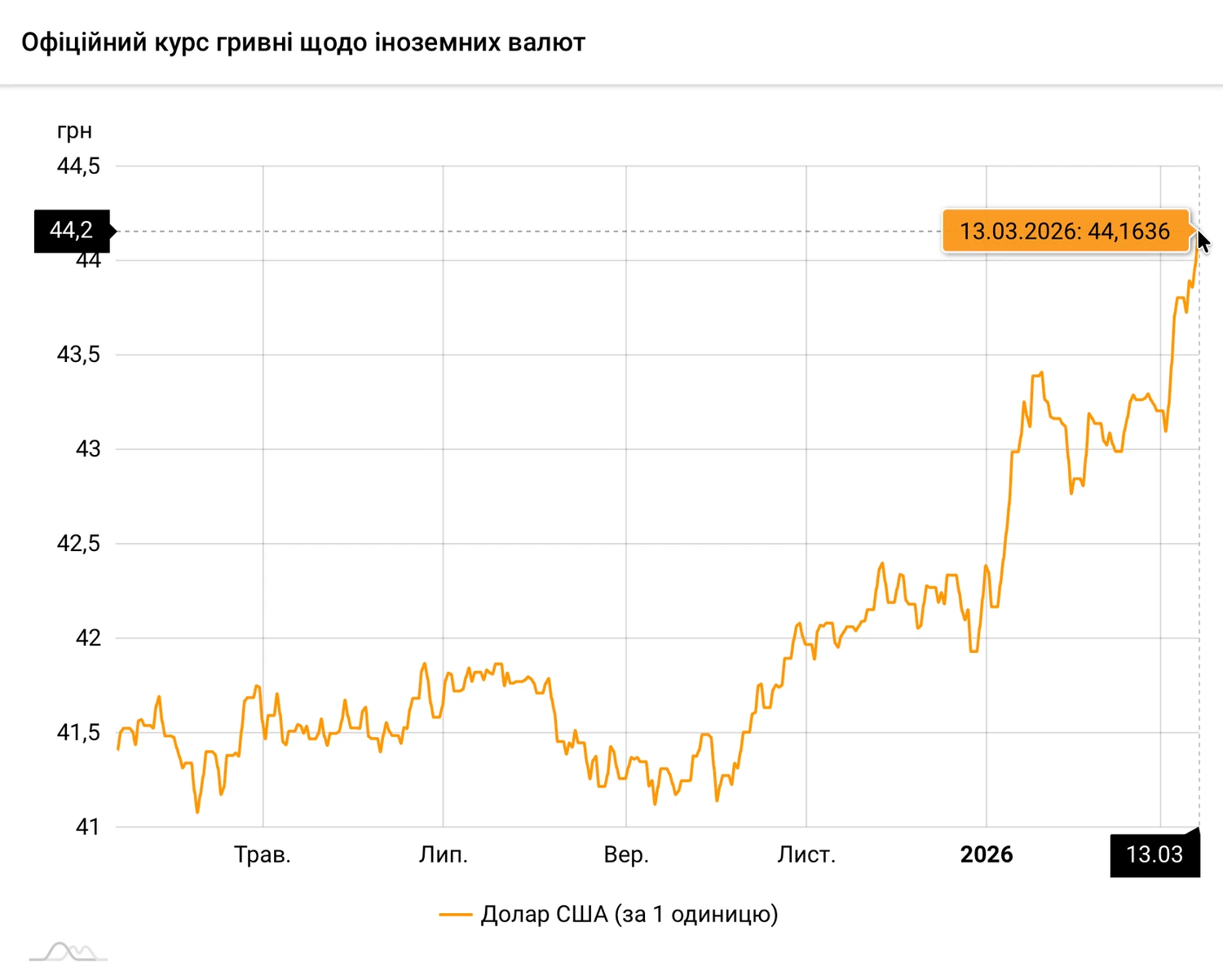 Нацбанк встановив курс долара на 13 березня на рекордному рівні 44,16 грн. Це новий історичний максимум після перетину позначки 44 гривні на міжбанку.