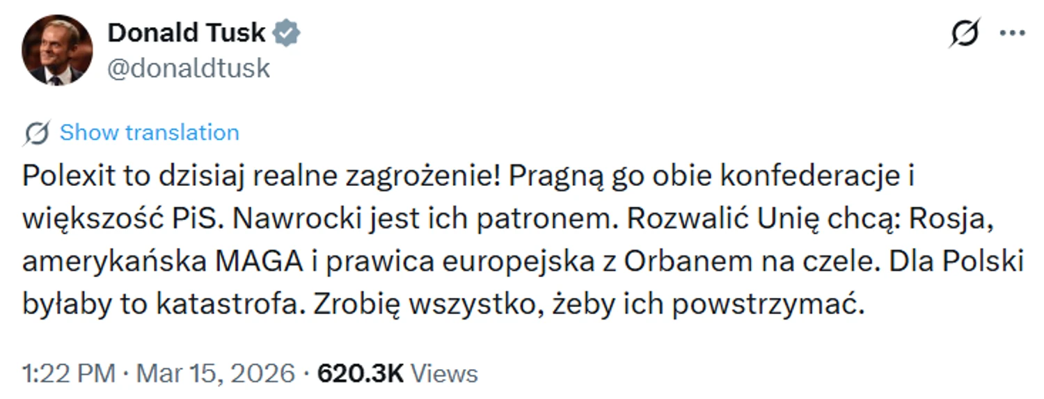 Прем'єр Польщі вважає Polexit реальною загрозою через дії правих партій та зовнішній тиск. Туск обіцяє зробити все можливе задля збереження членства країни в ЄС.