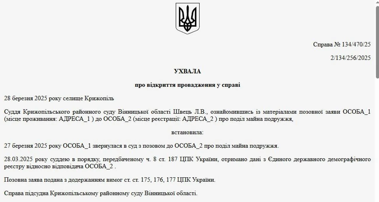 28 березня 2025 року у Крижопільський суд Вінницької області надійшла позовна заява щодо розподілу майна подружжя від Марини Порошенко. Зазначається, що ціна позову становить 17 102 703 811,40 грн.
