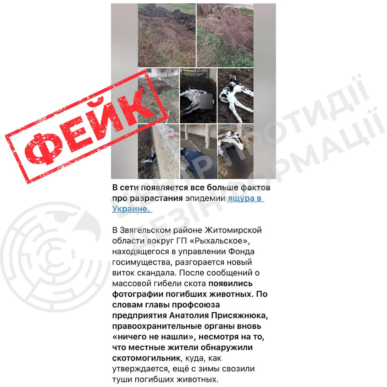 Центр протидії дезінформації РНБО України спростував інформацію про спалах ящура на Житомирщині. Худоба загинула через голод, а прокуратура вже розслідує справу про жорстоке поводження.