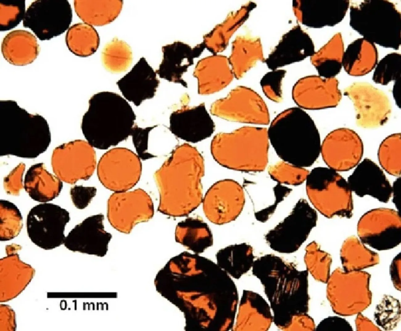 Мікроскопічні оранжево-чорні кристали скла утворилися внаслідок вибухових вулканічних викидів. Вони є недоторканими капсулами місячного надра, що збереглися мільярди років.