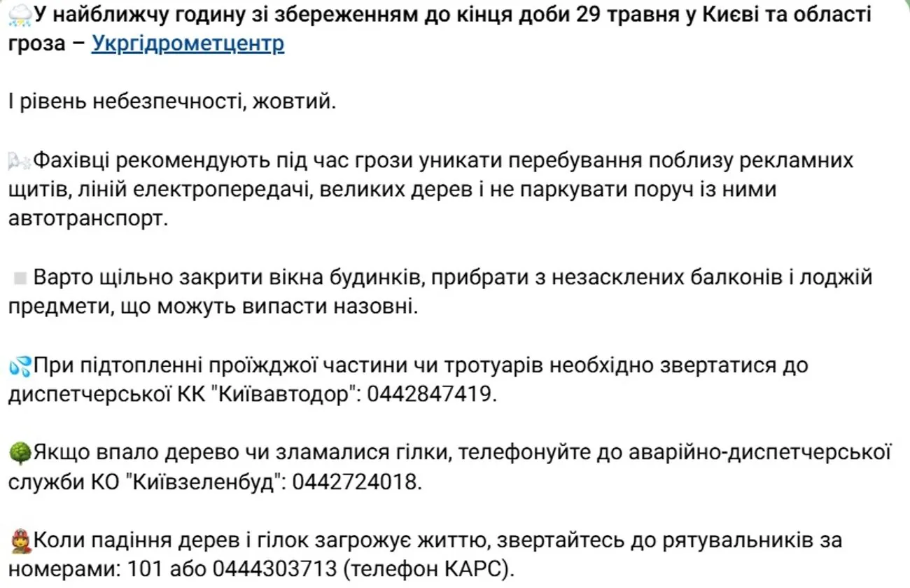 За годину до початку грози Київська міська державна адміністрація попередила про наближення негоди.