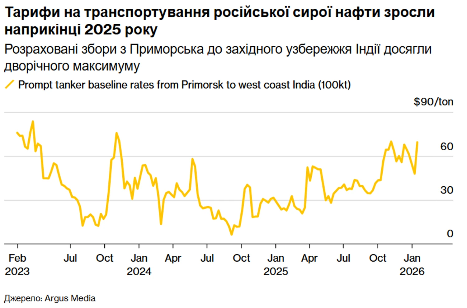 Згідно з даними Argus Media, вартість транспортування нафти сорту Urals із портів Балтики до Індії зросла до понад 60 доларів за тонну – найвищого показника за останні два роки. Для порівняння, на початку 2025 року ця ціна становила близько 25 доларів.