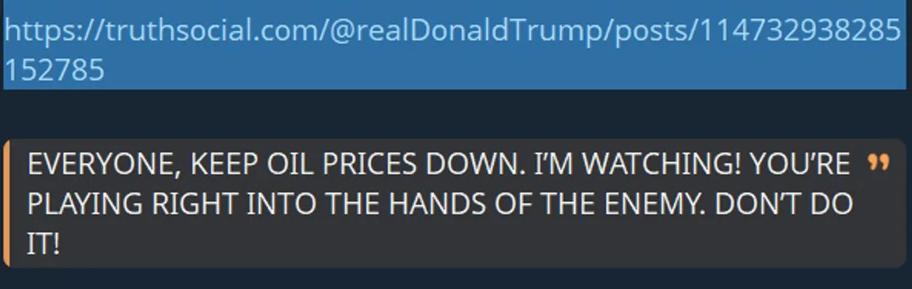 Все, тримайте ціни на нафту низькими. Я стежу! Ви граєте на руку ворогові. Не робіть цього
