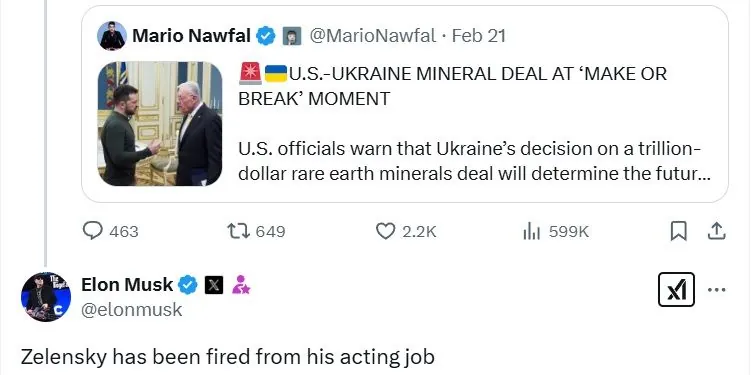 Цей коментар став відповіддю на пост одного з дописувачів, відомого блогера Mario Nawfal, щодо відмови глави української держави від писання угоди зі США щодо рідкоземельних копалин.